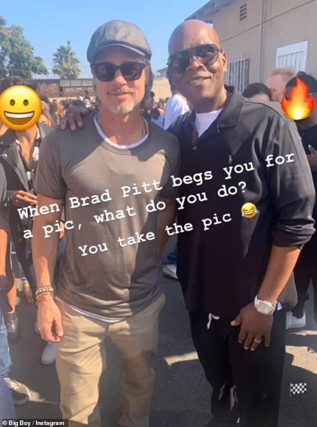 وكان من بين الحضور مقدم البرامج الإذاعية "بيغ بوي" الذي شارك متابعيه عبر موقع "إنستغرام" صورة التقطتها إلى جانب "بيت"، وكتب مُمازحًا: "حينما يتوسل براد بيت من أجل الاتقاط صورة برفقتك، ما الذي يجب عليك فعله؟ التقاط صورة".
