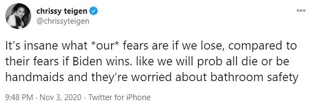 وقد شاركت عارضة الأزياء الأمريكية "كريسي تيغان" قلقها عبر حسابها على موقع "تويتر"، وكتبت: "إنه لأمر جنوني مقدار مخاوفنا إذ ما خسرنا، مقارنة بمخاوفهم إذا فاز بايدن. كما لو أننا سنموت جميعًا أو نكون خادمات وهم قلقون بشأن نظافة الحمام."
