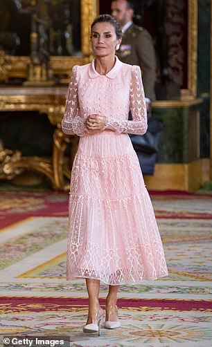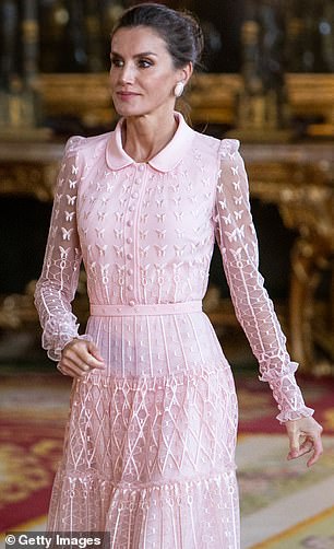 تألَّقت الملكة "ليتيزيا " مُرتديةً فستان وردي ماكسي من دار الأزياء الإسبانية " Felipe Varela"، جاء بأكمام طويلة من قماش الشيفون الشفاف منحها لمسة رومانسية حالمة، وما زادها جمالًا مكياجها الخفيف من درجات الوردي، وتسريحة شعرها المرفوعة الكلاسيكية.