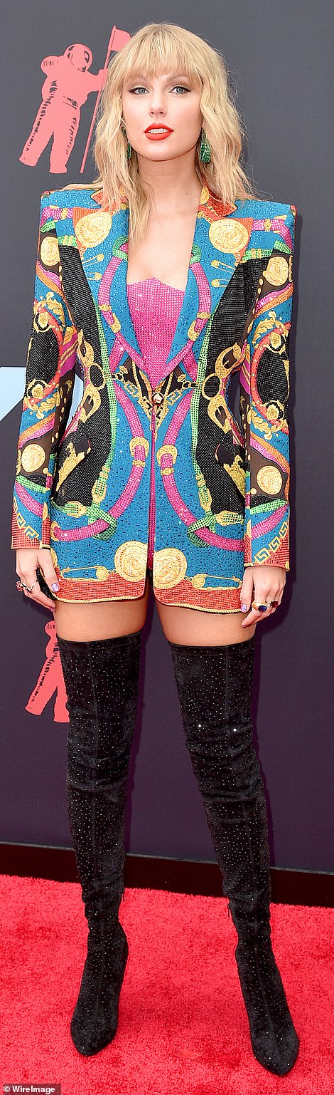 ولم ترتدي "تايلور" بنطالًا، بل اختارت بودي سوت فوشي مُزيَّن هو الآخر بحبيبات الكريستال.