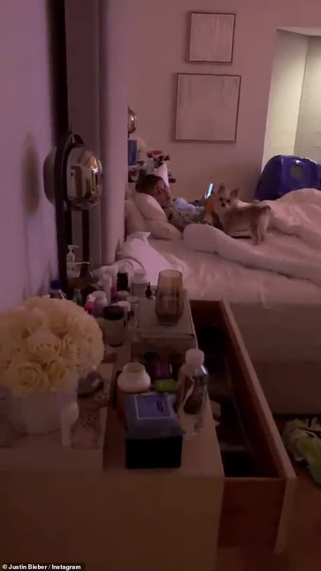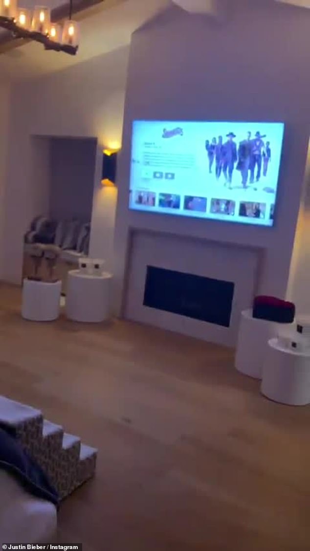 من بعدها ، توجَّه "بيبر" لغرفة النوم المُجهزة بأثاث أبيض حديث ومدفأة، حيث استلقت "هايلي" برفقة كلبها "أوسكار" على السرير يشاهدان التلفاز.