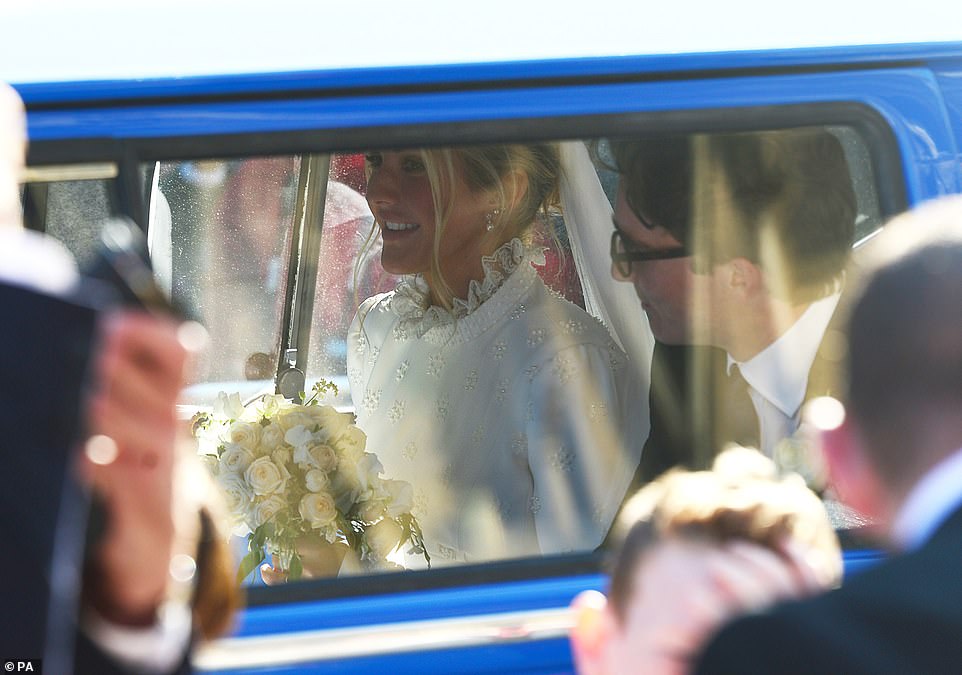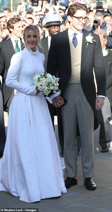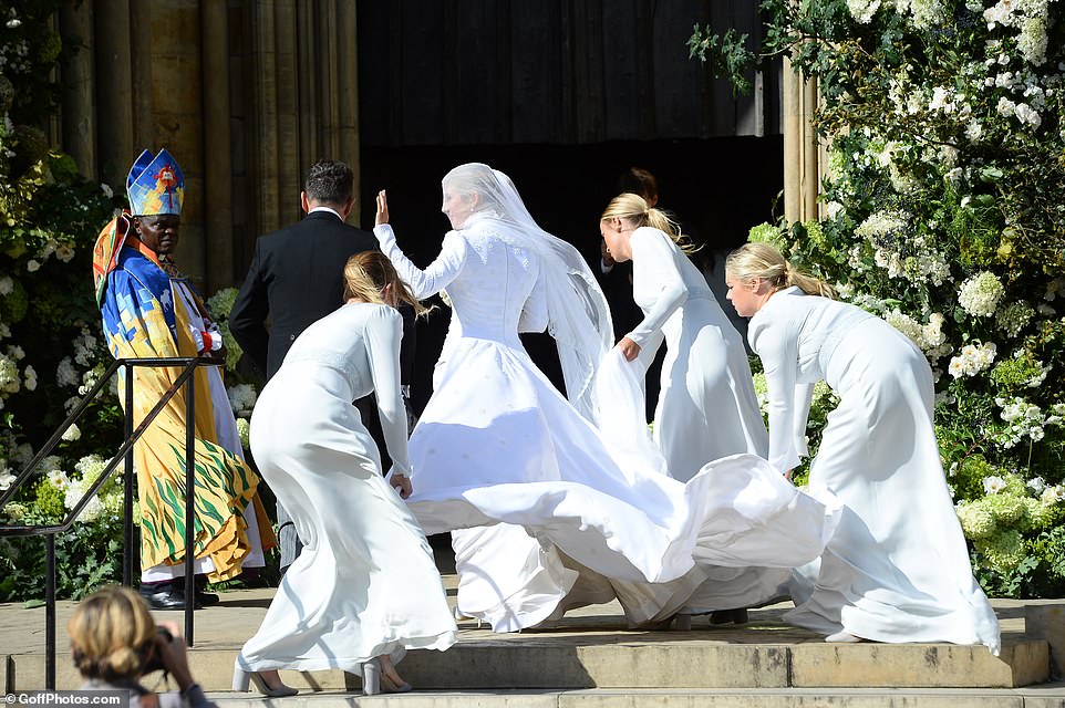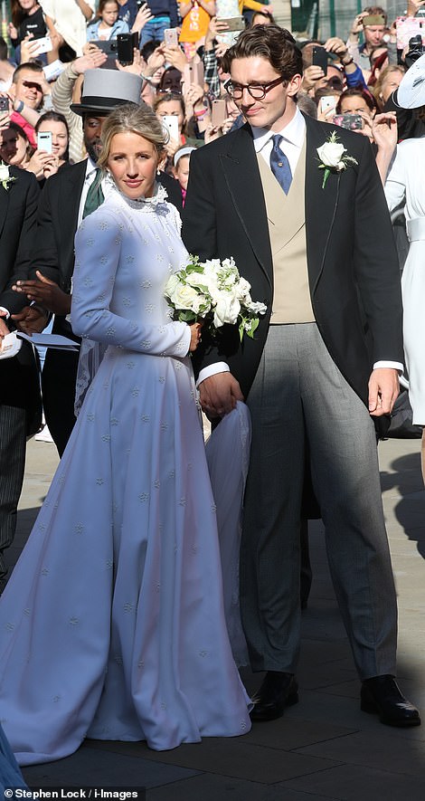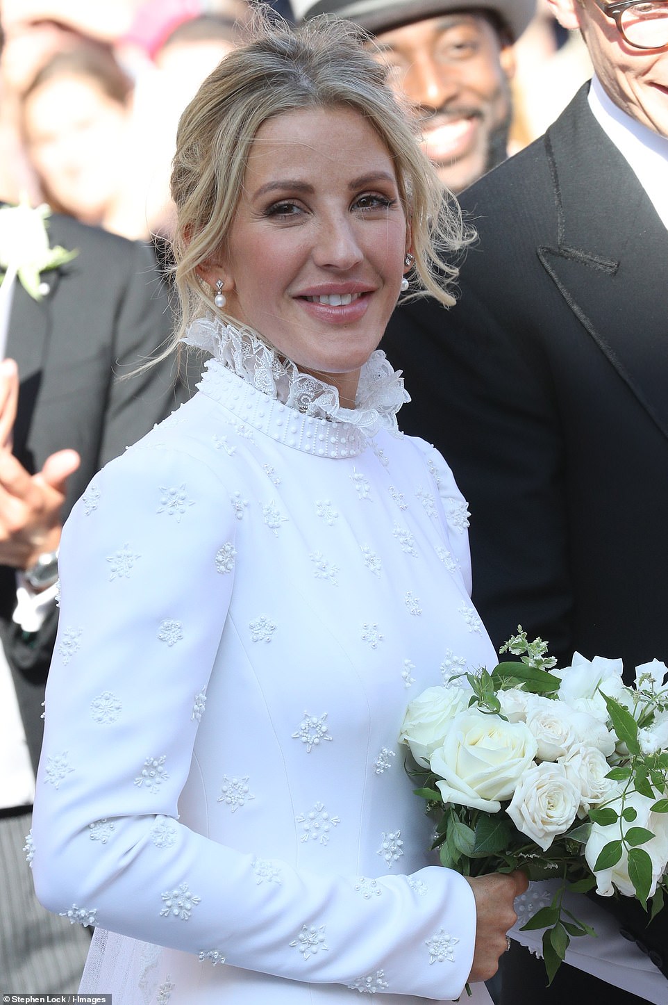 وحال نزولها من الحافلة الصغيرة الزرقاء متوجِّهةً إلى باب الكنيسة، خطفت "إيلي غولدينغ" (31 عاما) الأنظار بإطلالتها الملوكية البيضاء، فاختارت فستان زفاف أبيض من توقيع دار الأزياء الفرنسية "Chloe"، أشرفت على تصميمه مصممة الأزياء الشهيرة "ناتاشا رامساي ليفي"، بينما وقفت إلى جانبها إشبيناتها اللواتي ارتدين فساتين بيضاء أنيقة.