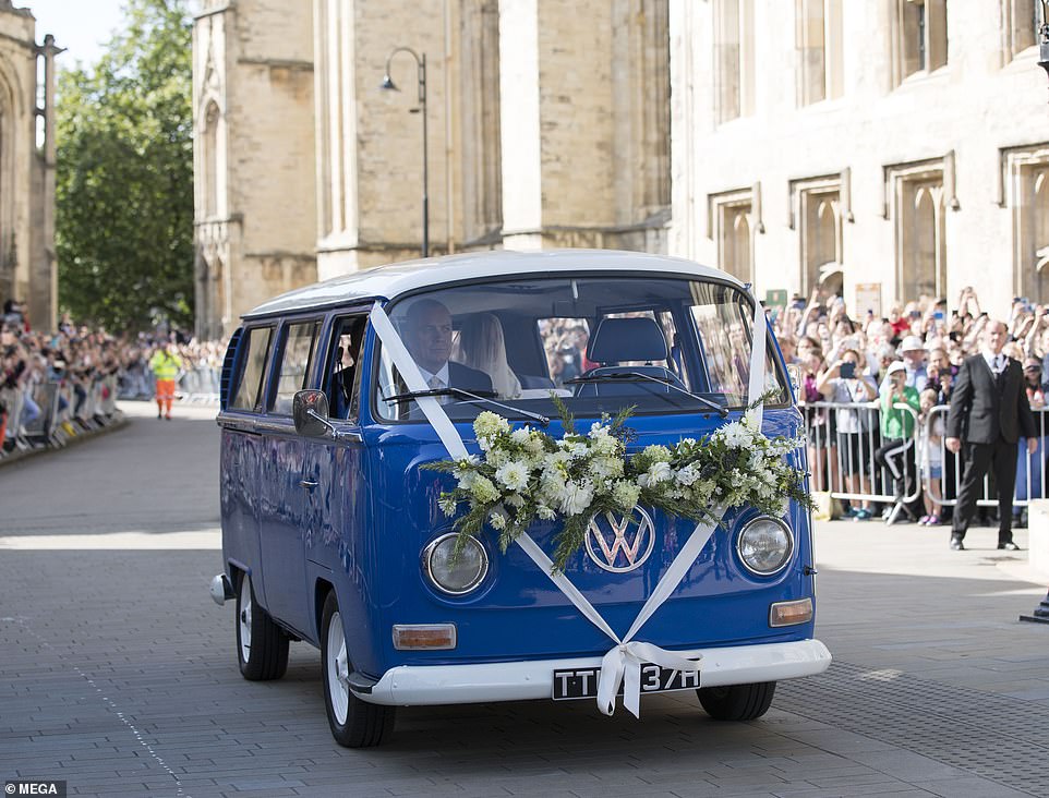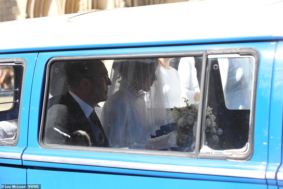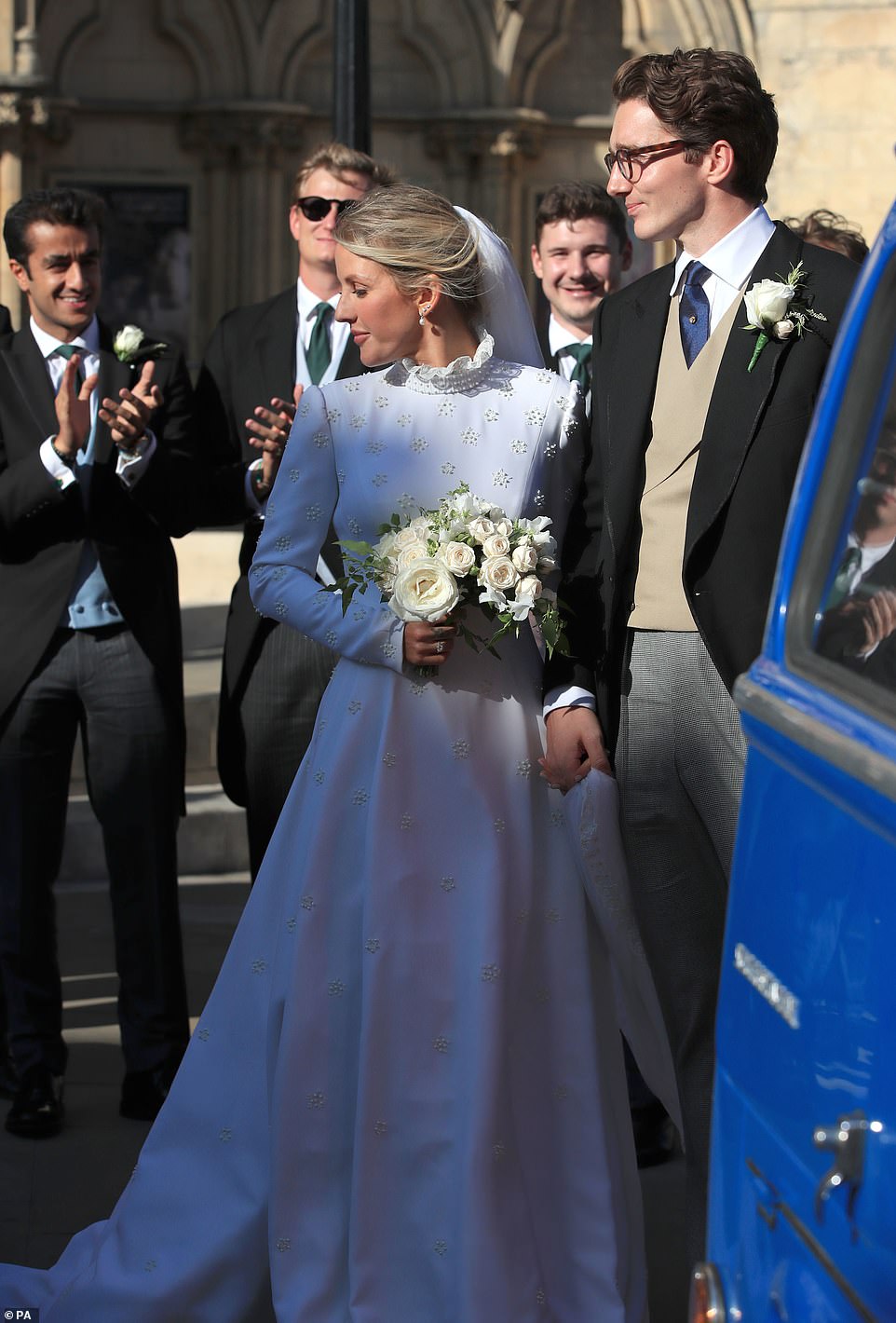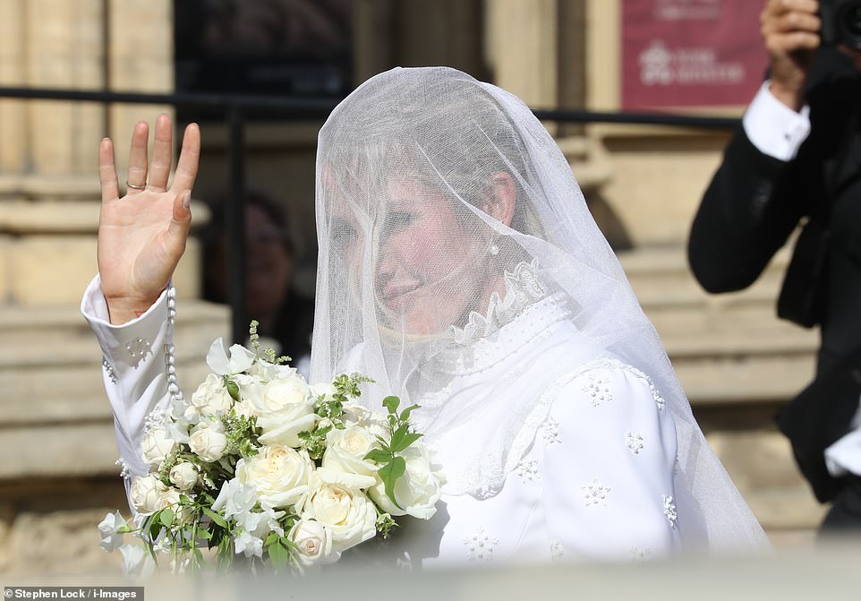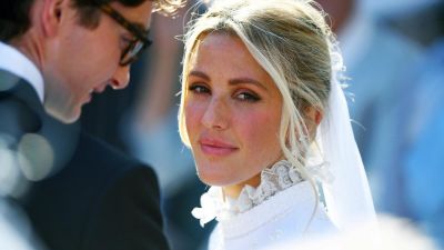 وحال نزولها من الحافلة الصغيرة الزرقاء متوجِّهةً إلى باب الكنيسة، خطفت "إيلي غولدينغ" (31 عاما) الأنظار بإطلالتها الملوكية البيضاء، فاختارت فستان زفاف أبيض من توقيع دار الأزياء الفرنسية "Chloe"، أشرفت على تصميمه مصممة الأزياء الشهيرة "ناتاشا رامساي ليفي"، بينما وقفت إلى جانبها إشبيناتها اللواتي ارتدين فساتين بيضاء أنيقة.