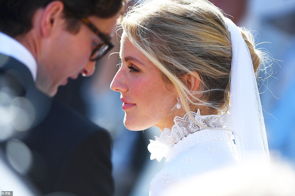 واعتمدت "إيلي"، حبيبة الأمير "هاري" السابقة، تسريحة شعر مرفوعة على شكل كعكة وأسدلت الخصلات الأمامية على جانبي وجهها بطريقة مموجة، وحملت بيدها باقة من الورود البيضاء.