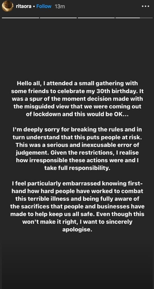 أصدرت المغنية الأمريكية "ريتا أورا" اعتذارًا بعد خرقها للقوانين من خلال استضافة حفل بمناسبة عيد ميلادها الثلاثين وسط جائحة كورونا.