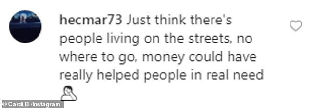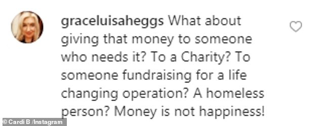 وعلَّق آخر: "ماذا عن إعطاء المال لشخص يحتاجه؟ لجمعية خيرية؟ لشخص يحتاج تبرعات لتغيير حياته؟ شخص بلا مأوى؟ المال ليس السعادة".