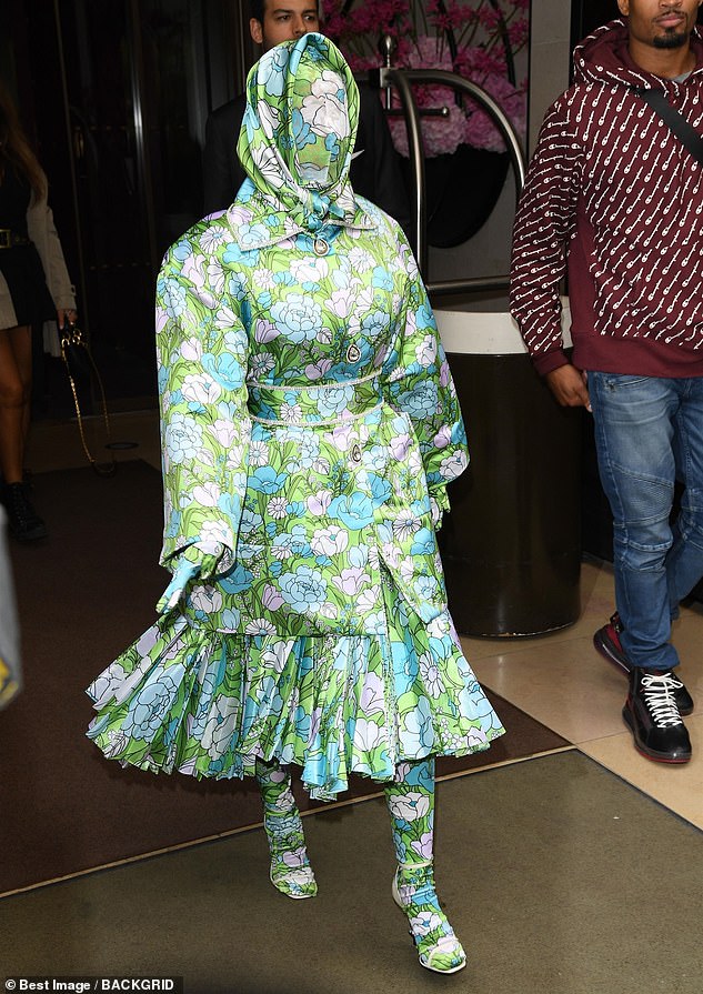 ارتدت "كاردي" (26 عامًا) إطلالة مُزيَّنة بطبعات على شكل ورود ملوَّنة بالأزرق، والأخضر، والأرجواني الباهت، تألَّفت من معطَّف فضفاض طويل وتنورة بكشاكش، بالإضافة إلى حذاء ذي كعب عالٍ وليغينغ بذات الطبعة، وليس هذا فحسب بل غطَّت شعرها بوشاح ووجها بستارة ويديها بقفازات، في حين أبرزت خصرها بحزام مُرصَّع بالألماس.