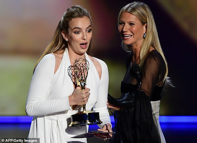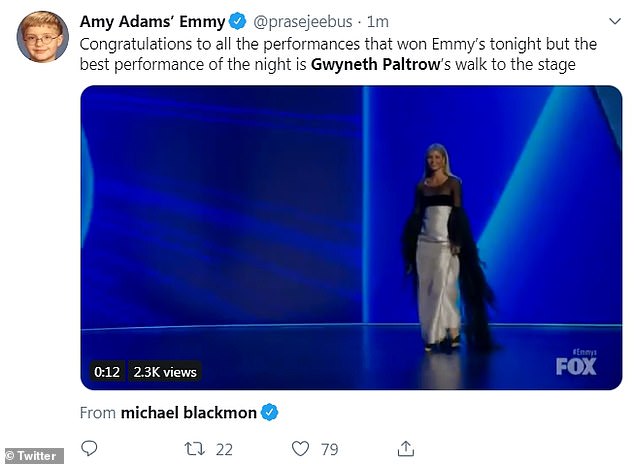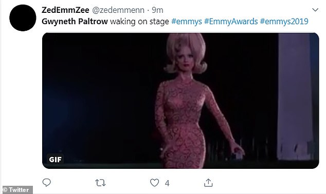 اعتلت "غوينيث بالترو" خشبة مسرح الحفل لتسليم جائزة أفضل ممثلة بدور رئيسي في مسلسل درامي للنجمة "جودي كومر"، ورغم إطلالتها المُبهرة، إلّا أنها لفتت الأنظار إلى مشيتها الغريبة، فيبدو أن فستانها الفضي الضيق كان يعيق سيرها.