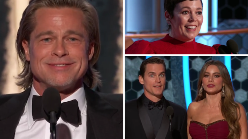 أثناء إلقاء النجم الأمريكي "براد بيت" خطابه على خشبة المسرح بعد استلام جائزته، اختتم كلامه بالسخرية من الأخبار المُتداولة حول علاقاته بنساء مختلفات منذ انفصاله عن طليقته النجمة الأمريكية "أنجلينا جولي"، وعلى الفور صوِّبت الكاميرات ناحية زوجته السابقة "جينيفر أنيستون" التي ضحكت على نكاته.