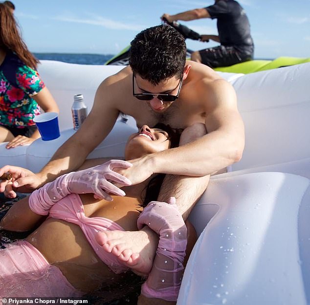 ويبدو أن بريانكا قضت عطلتها على متن يخت صغير، فظهرت في الصورة وهي تضع نظارة شمسية، وتمسك شعرها الذي يتطاير في الهواء، كما تواجدت في لقطة أخرى وهي في حضن زوجها نيك، وقد ارتدت توب زهري، نسّقته مع تنورة مطابقة، كما أضافت عُنصرًا غريبًا لإطلالتها، ألا وهو قُفّازاتٍ طويلة مُطابقة للون إطلالتها البحرية.
