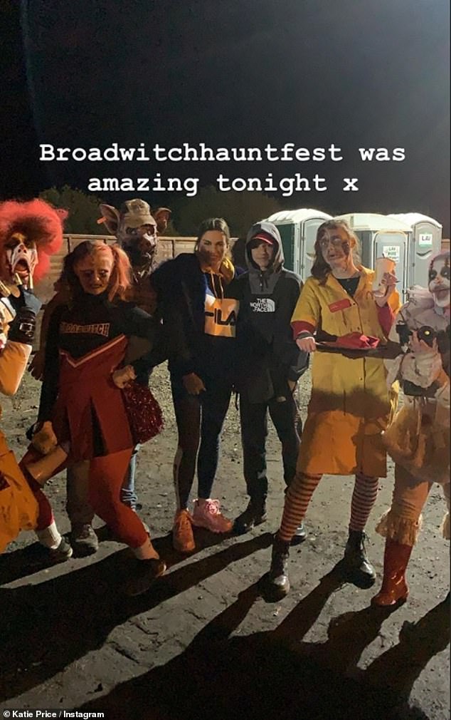 بعدها شاركت كاتي معجبيها بصورة تجمع بينها وبين كريس ونجلها وهم يرتدون معاطف ثقيلة حيث كان الجو شديد البرودة وهم يقضون أمسية في Broadwitch Hauntfest 2019 في ساوثفليت.