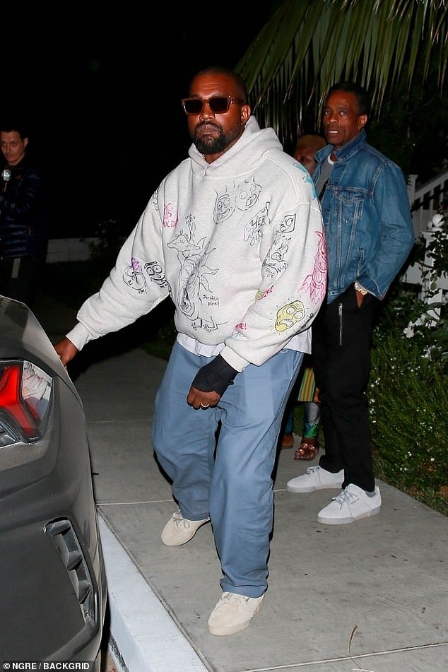 ولم يكن كانيه أكثر أناقة من زوجته، فقد ظهر بإطلالة مشابهة لها، فارتدى بنطال أزرق، نسّقه مع بلوزة هودي باللون الرمادي، وعلى الرغم من حلول الليل، إلا أنه كان يضع نظارة شمسية سوداء.