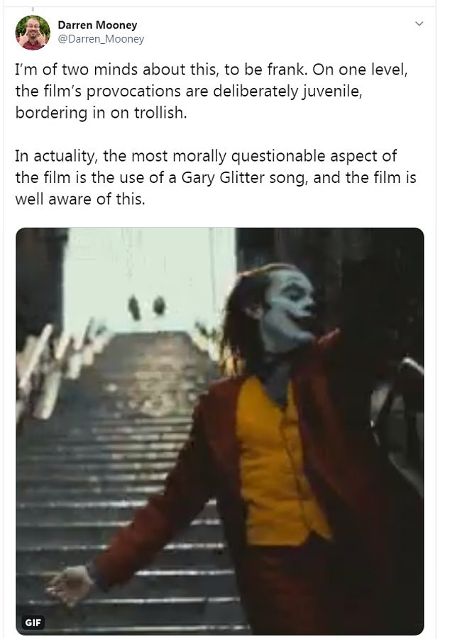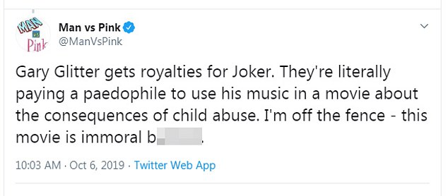 وعلَّق أحد المستخدمين: " غاري غليتر يحصل على نسبة من عائدات فيلم Joker، إنهم يدفعون لمعتدي على الأطفال من أجل استخدام موسيقاه في فيلم  يتحدث عن عواقب الإساءة للأطفال."