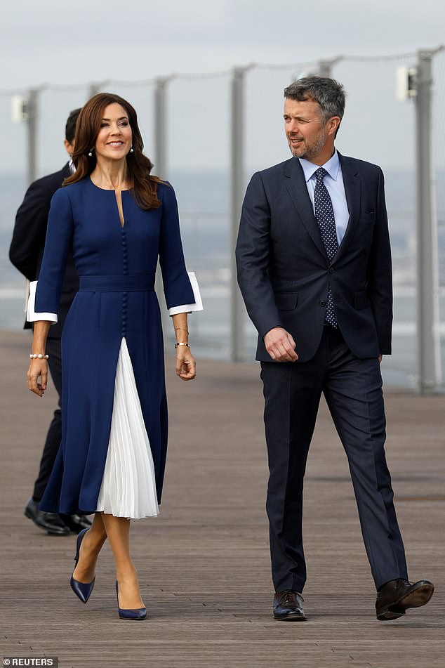 أما زوجها فريدريك فقد اختار أن يكون بنفس مستوى أناقة زوجته وهو يرتدي بدلة أنيقة بربطة عنق بيضاء وزرقاء لتتناسب مع إطلالة ماري.