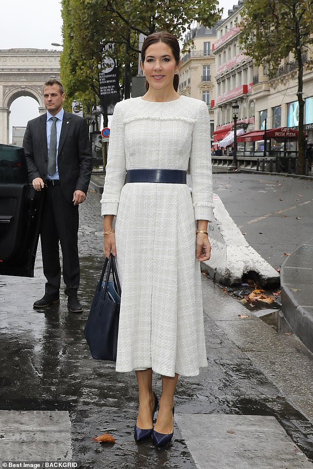 وبدت الأميرة بكامل أناقتها عندما وصلت إلى ساحة المعارض التي تعرض الثقافة الدنماركية في شارع الشانزليزيه، فارتدت فستان أبيض كلاسيكي طويل الأكمام ومزيّن بكسرات عريضة من الأسفل من مجموعة شانيل.