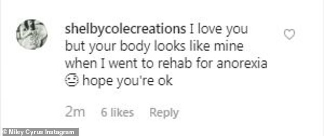 وكانت مايلي تتمتع بمناظر وعلّقت على الصورة: "لكن إذا نظرت عن كثب يمكنك أن ترى ذلك في عيني هذه الفتاة ستجد دائماً طريقها"، إلا أن المستخدمين سارعوا إلى ملاحظة النحافة وانتقلوا إلى التعليقات.