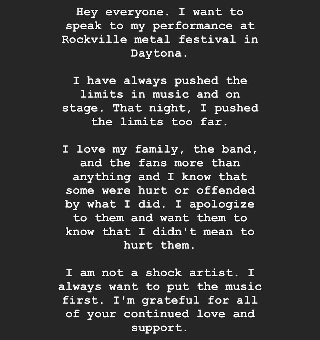 كما قامت النجمة المثيرة للجدل شخصياً بتقديم اعتذار شخصي لها عبر صفحتها الخاصة على "انستغرام" كتبت فيها: "مرحبا جميعاً أريد أن أتحدث عن أدائي في مهرجان روكفيل ميتال، كنت أتجاوز الحدود في الموسيقى دائماً ولكن في تلك الليلة تجاوزت الحدود أكثر من اللازم".