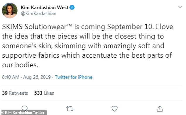 كما أضافت: "بعد الكثير من التفكير والإعتبار، يسرّني الإعلان عن إطلاق SKIMS Solutionwear في 10 سبتمبر"، وتابعت: "أحب فكرة أن القطع ستكون أقرب شيء إلى بشرة شخص ما، حيث يتخللها أقمشة ناعمة وداعمة".