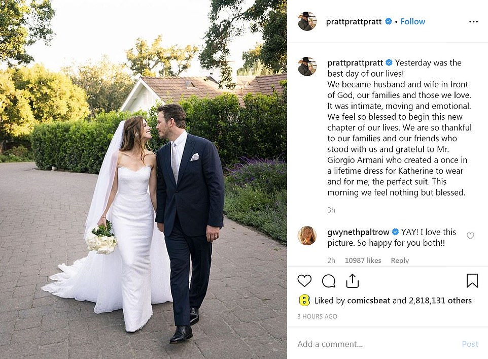 وبعد يوم من زواجهما، توجَّه "كريس برات"، البالغ من العمر 39 عامًا، للتعبير عن حبه لزوجته عبر حسابه على موقع "إنستغرام" يوم الأحد الماضي، وشارك معجبيه صورة لحفل زفافه ممسكًا يد "كاثرين" التي تألَّقت مرتدية فستان أبيض سترابلس أنيق بقصة حورية البحر.