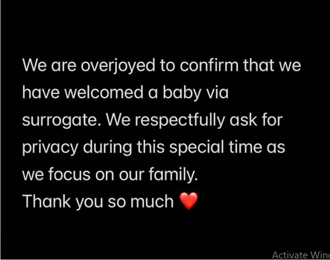 استقبلت النجمة البوليوودية "بريانكا شوبرا" طفلها الأول عن طريق أم بديلة حيث أعلنت ذلك عبر صفحتها على "انستغرام" لكنها لم تكشف أي تفاصيل حول جنس الطفل أو اسمه.