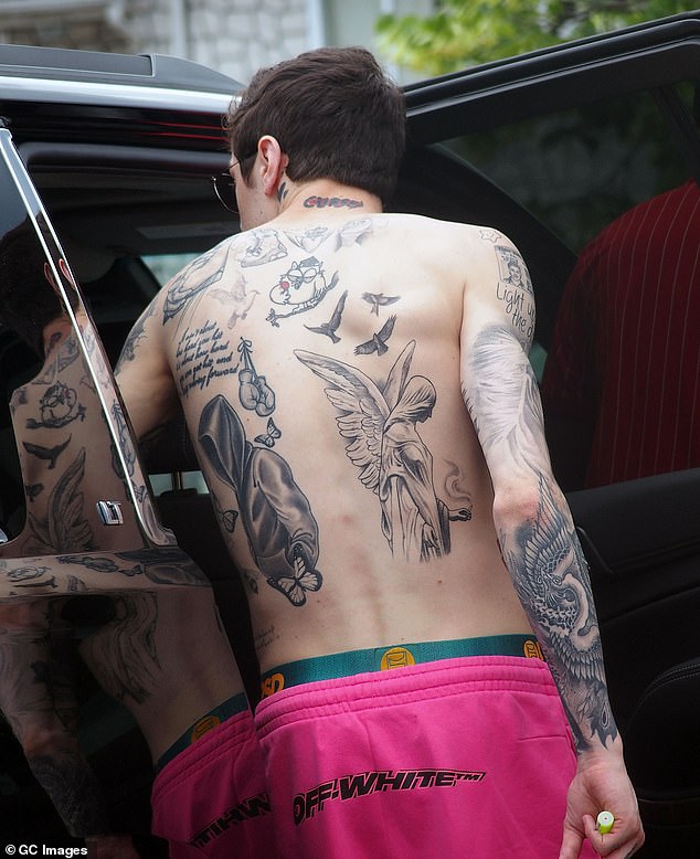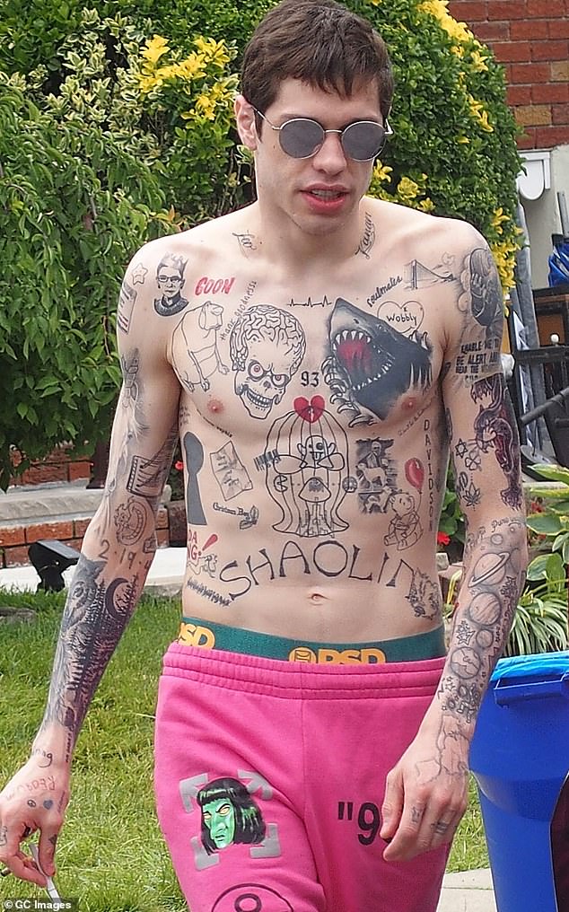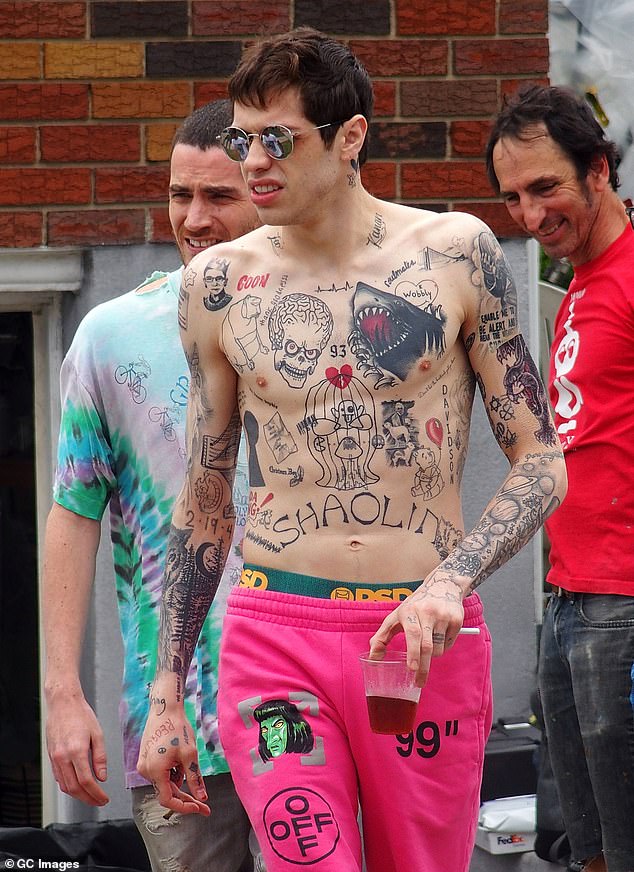 شوهد النجم "بيت ديفيدسون" بالقرب من منزل طفولته في جزيرة ستاتن في نيويورك، حيث كان يقوم بتصوير فيلم سيرته الذاتية، وظهر بيت عاري الصدر، ليستعرض وشومه الجديدة على جسده.