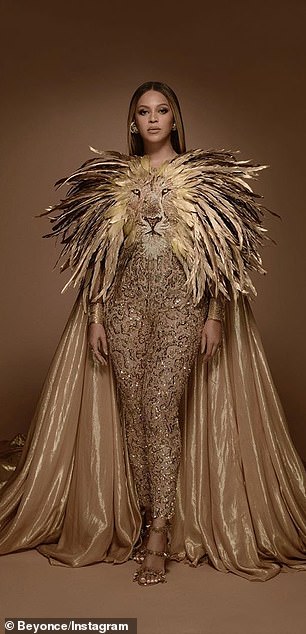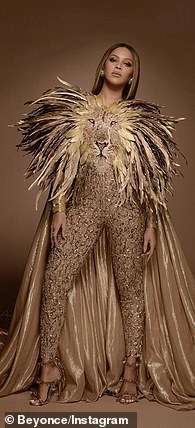 واختطفت الأم وابنتها الأنظار بإطلالتهما العصرية باللون الذهبي، حيث ارتدت بيونسيه جمبسوت لامعًا بشكل ملفت، مزيّنًا بوجه أسد على الصدر مع ريش، كما أتى من الخلف مع قطعة قماش طويلة، ونسّقت معه حذاءً مفتوحًا مطابق اللون.