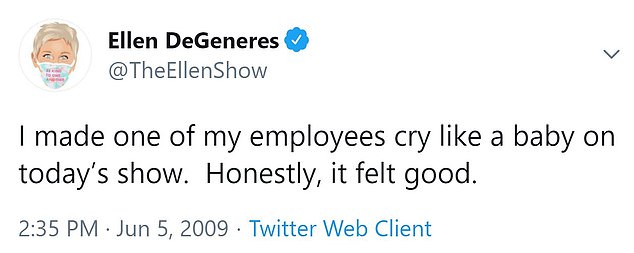 ورغم إنكارها المتكرر ونفيها هذه الحوادث المزعومة بنظرها، ظهر على سطح تغريدة قديمة كانت قد نشرتها عبر حسابها الرسمي على موقع "تويتر" عام 2009، جاء فيها: "لقد جعلت أحد موظفيني يبكي مثل طفل في برنامج اليوم. بصراحة، لقد شعرت بالارتياح ".