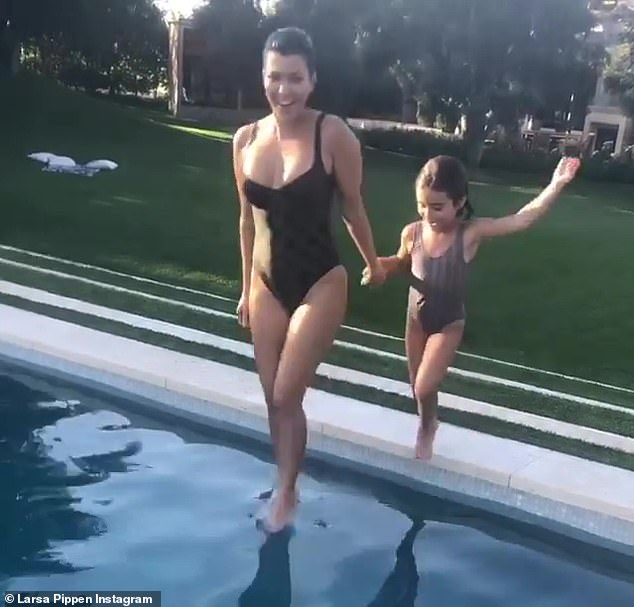 أمضت كورتني الكثير من الوقت على شاطئ البحر في عطلة نهاية الأسبوع، على الرغم من وجود حمام سباحة خاص بها في منزلها، حيث ظهرت في حفل صديقتها Chandelier Sia، وهي ترتدي مايوه من قطعة واحدة، بينما تسبح مع ابنتها بينيلوبي.