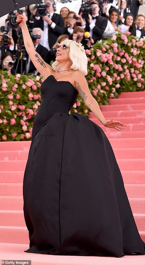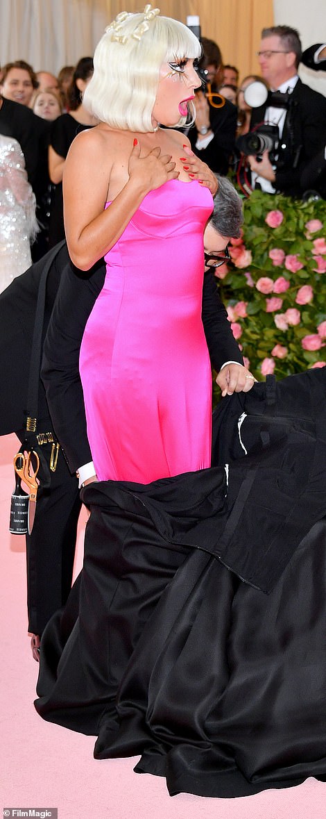 وبعد فترة قصيرة، خلعت غاغا معطفها الفوشي الضخم، ليظهر أسفله فستاناً أسوداً بقصتين، الباكلس والنفاش من الأسفل، وحملت مظلة سوداء.