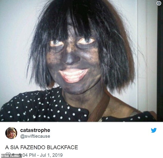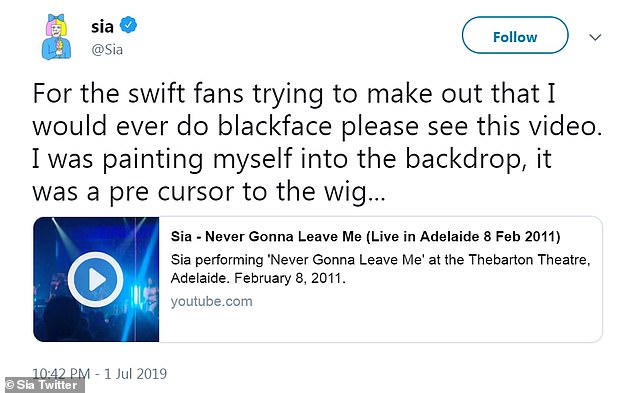 ولاحقاً اضطرت سيا للدفاع عن نفسها ضد هذه الإتهامات بقولها: "إلى معجبين تايلور الذين يحاولون إثبات أنني واجهة سوداء، يرجى الإطلاع على هذا الفيديو، لقد كنت أرسم نفسي لأختلط مع خلفية العروض، واستخدمت شعراً مستعاراً لذلك"، وتبيّن في الفيديو المنشور وهي تؤدي أغنيتها Never Gonna Leave Me، حيث كانت ترتدي لوناً أسود مطابق لخلفية الفيديو.