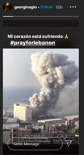 شاركت "جورجينا رودريغيز" متابعيها الذين يصل عددهم أكثر من 19.7 مليون متابع على موقع "إنستغرام" مقطع فيديو يوثِّق لحظة انفجار المرفأ وكتب: "قلبي يعاني"، وأرفقته بهاشتاغ "صلوا للبنان".