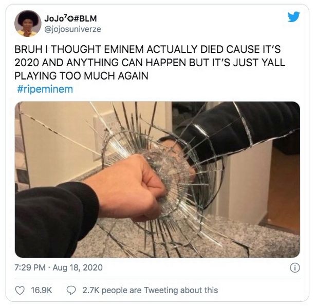من جهة أخرى، أثار محبوه فوضى كبيرة في أرجاء "تويتر" مع تصدر الهاشتاغ، متخيلين أن الأسوء قد حدث، فكتب أحدهم: "اعتقدت أن إيمنيم قد توفي في الحقيقي، فكما تعلمون أنه عام 2020 وأي شيء ممكن وقوعه، لكنكم تخطيتم الحدود."