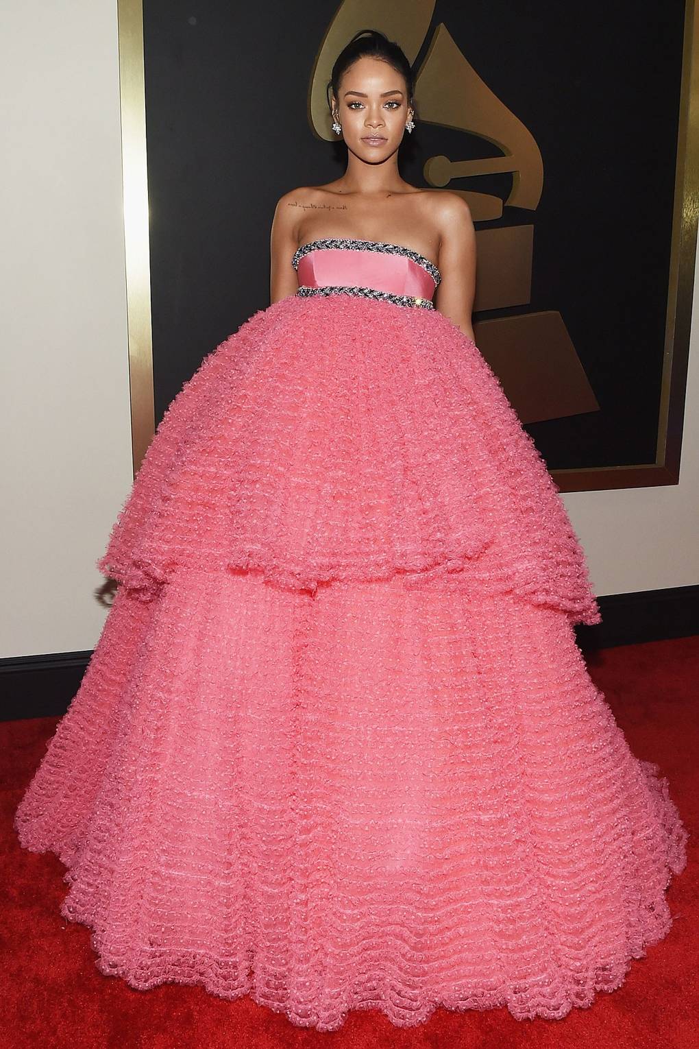 كذلك ركزت ريهانا على قصة شعر البوب، لتكون عنوان جمالها، متألقة بفستان مذهل من روبرتو كافالي في حفل جوائز غرامي.