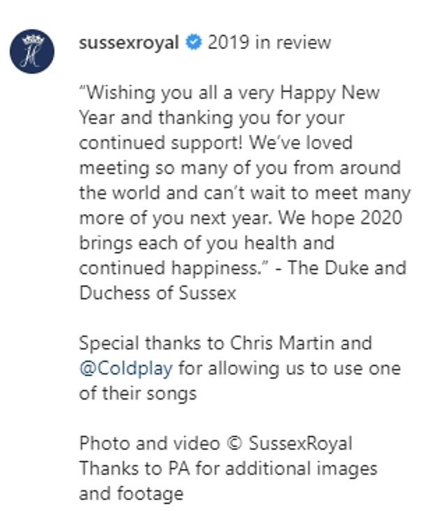 وتابعا قولهما: "لقد أحببنا مقابلة الكثير منكم من جميع أنحاء العالم ولا يمكننا الانتظار لمقابلة الكثير أيضاً في العام المقبل نأمل أن يجلب عام 2020 لكم الصحة والسعادة المستمرة، دوق ودوقة ساسكس".