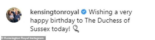وجاءت تهنئة دوق ودوقة كامبريدج، بعد أن نشر الأمير هاري رسالة جميلة إلى زوجته يتمنى لها عيد ميلاد سعيد، بجانب صورةً لها وهي في تونغا، فقال: "عيد ميلاد سعيد لزوجتي المذهلة، شكراً لإنضمامك لي في هذه المُغامرة".