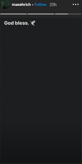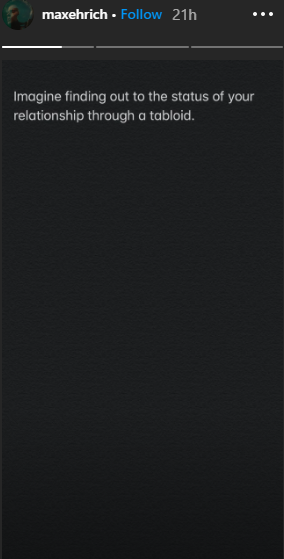من جهة أخرى، أشار "ماكس" أنه لم يعلم بخبر انفصالهما إلَّا عن طريق الصحف العالمية ومواقع التواصل الاجتماعي، ونشر عبر خاصية "إنستغرام ستوري" صورة لخلفية سوداء كتب عليها: "تخيل أن تعرف حالتك الاجتماعية عبر الصحف".