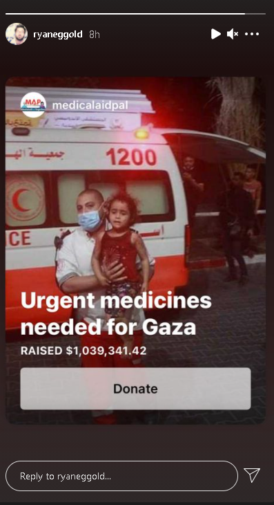 وشارك ريان في تمويل جماعي من قبل Medical Aid Pal  يدعو فيه للمساعدة في الحصول على الإمدادات الطبية لغزة تزامناً مع ارتفاع عدد القتلى والجرحى.