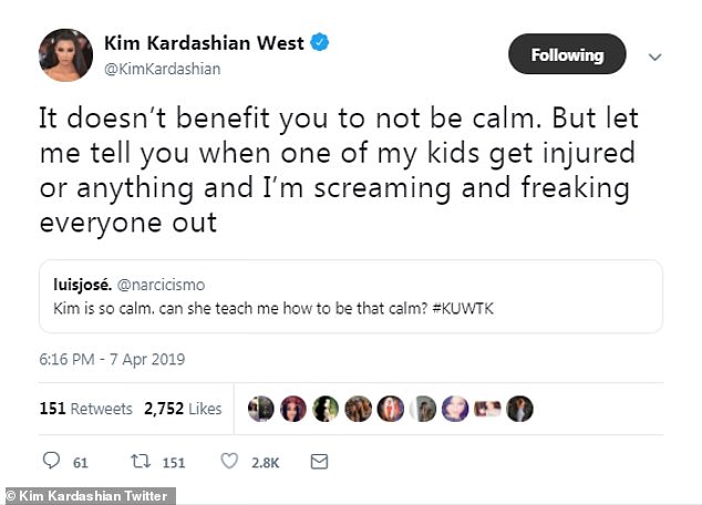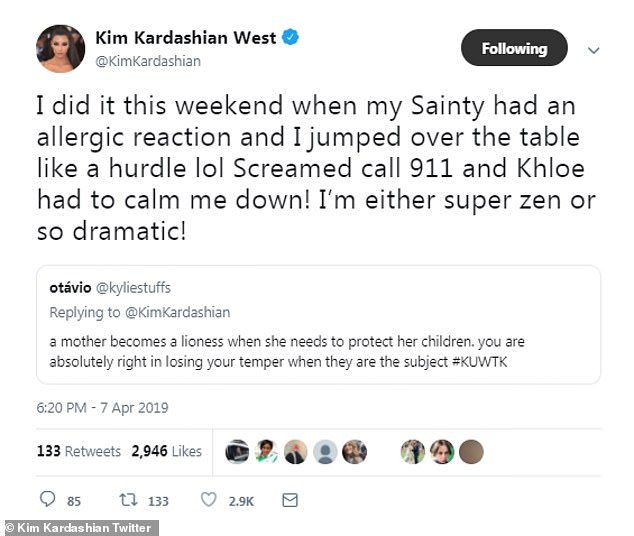 وحينما أكَّد أحد الأفراد على كلامها، مُشيرًا أن الأم تتحول إلى نمر حينما يتعلق الأمر بحماية أطفاله فيفقد المرء حينها أعصابه، لترد "كيم" بتغريدة، جاء فيها: "هذا ما مررت به هذا الأسبوع، فقد أصيب ابني سانت برد فعل تحسسي، فقفزت فوق الطاولة كحاجز وأنا أصرخ، ثم اتصلت بالطوارئ، بينما حاولت شقيقتي كلوي تهدئتي."
