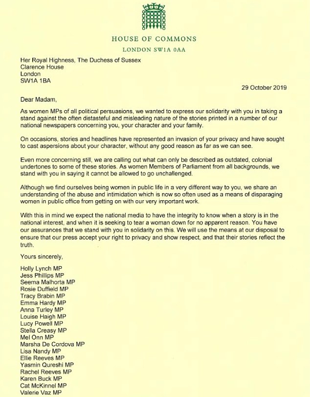 أطلقت النائبة في البرلمان البريطاني هولي لينش، حملة دعم وتأييد لدوقة ساسيكس ميغان ماركل، وجمعت التوقيعات من 72 سيدة من عضوات البرلمان، تتضمن موقفهن الداعم لميغان، ورفضهن للحرب الشعواء التي تواجهها الدوقة.