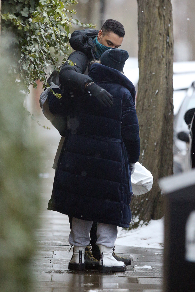 في الصور، يُعانق "بادج" حبيبته بلطلف تحت زخات الثلوج قبل أن يتجه مسافرًا إلى مدينة نيويورك لتصوير مشاهد الموسم الثاني من المسلسل Bridgerton.