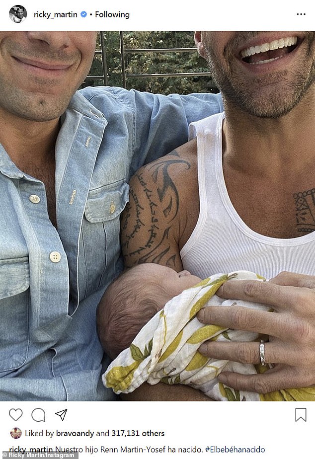 شارك "ريكي مارتن" متابعيه عبر موقع "إنستغرام" لمحة خاطفة لمولودهما الجديد الذي أسمياه "رين"، حيث نشر صورة له ولزوجه يظهر منهما ابتسامتهما فقط، بينما يحتضن طفله الرضيع بين ذراعيه، وكتب بالإسبانية: "ولد ابننا رين مارتن يوسف".