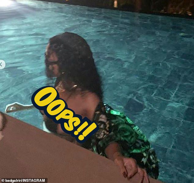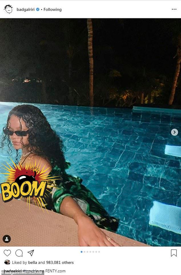 وظهرت ريهانا في الصور وهي ترتدي بكيني ناعم بينما كانت تسبح في المياه حيث أظهرت لقطات مثيرة من صدرها من الجانب وعلّقت على الصورة: "مشكلة في FENTY.com".