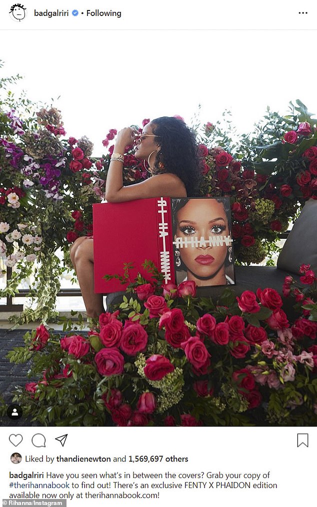 وشاركت "ريهانا" متابعيها عبر حسابها على موقع "إنستغرام" الأخبار السارة عبر نشر صورة عارية لها في باحة منزلها المحاطة بالورود الحمراء والأرجوانية، في حين غطَّت جسدها بكتابها الضخم الذي يضم 504 صفحة، وعلَّقت: "هل رأيتم ما بين صفحتي الغلاف؟ احصلوا على نسختكم."