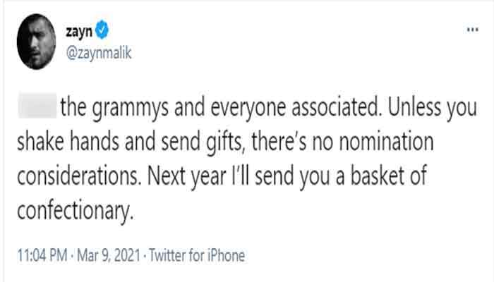 نشر العضو السابق في فرقة One Direction تغريدة لاذعة يوم الثلاثاء أشار فيها على ما يبدو إلى تزوير جوائز غرامي، وكتب: "تبًا لجوائز غرامي ولأي شخص مرتبط بها، ما لم تصافح وترسل هدايا، فلا توجد اعتبارات ترشيح. في العام القادم سأرسل لكم سلة حلويات".