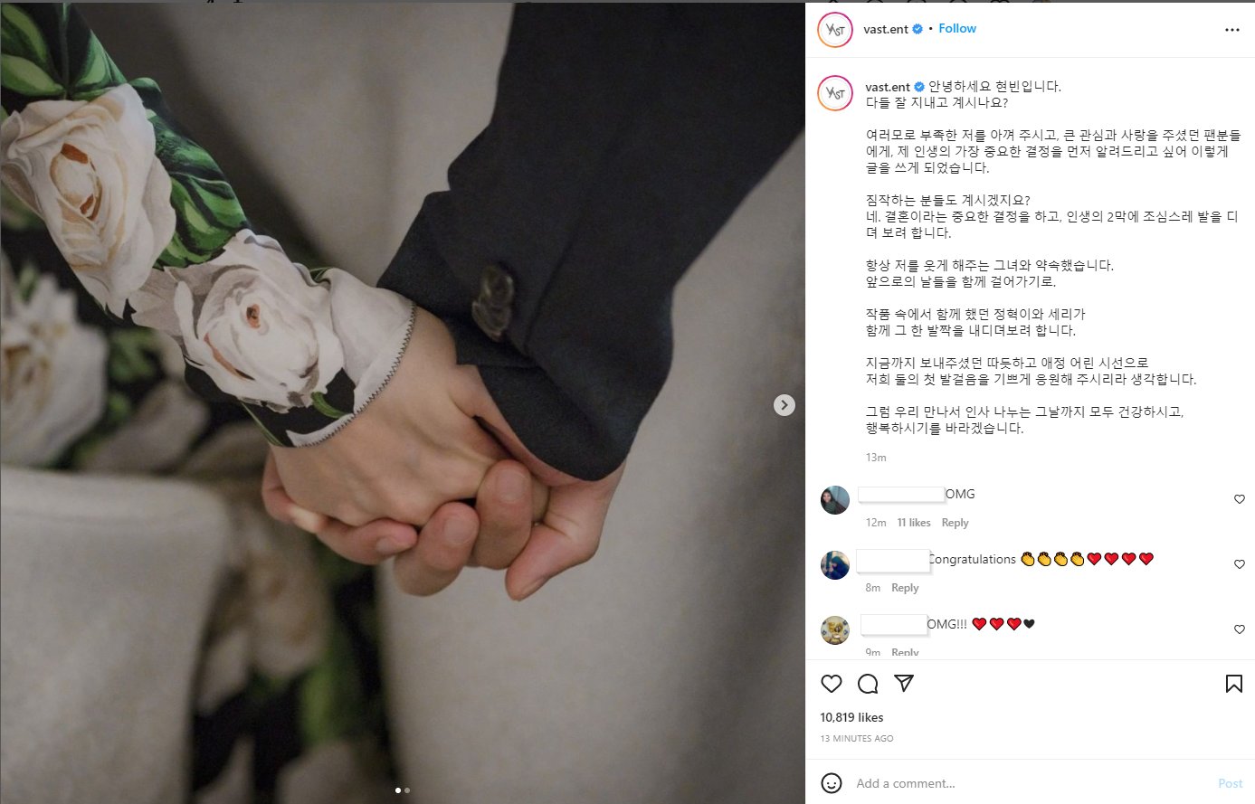 من جهته، نشر الفنان الوسيم منشور عبر حسابه على "إنستغرام" ممسكًا بيد زوجته، وكتب: "مرحبًا، أنا هيون بين، كيف حال الجميع؟ أكتب هذا لأنني أريد أن أبلغ المعجبين الذين اهتموا بي ومنحوني اهتمامًا وحبًا كبيرين عن أهم قرار في حياتي".