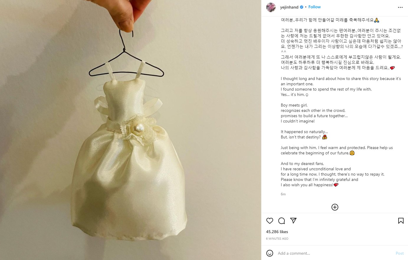 كشفت سون يي جين الأخبار السعيدة عبر منشور شاركته مع متابعيها عبر حسابها على "إنستغرام"، حيث نشرت مجسم صفير لفستان زفاف مُرفقًا بمنشور طويل كتبت فيه: "قبل كتابة هذا المقال، كنت قلقة جدًا بشأن كيفية التعبير عن مشاعري، أردت أن أحكي قصة جميلة لأنها قصة ثمينة ومهمة، فلقد وجدت شخصًا أقضي بقية حياتي معه، نعم، الشخص الذي تعتقد أنه هو شريك الحياة.. إنه الشخص الذي أشعر إلى جانبه بالدفء والطمأنينة".