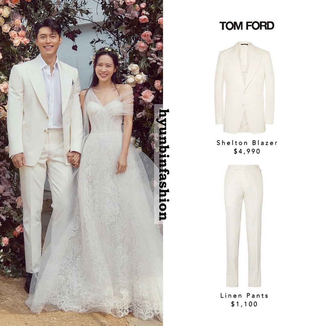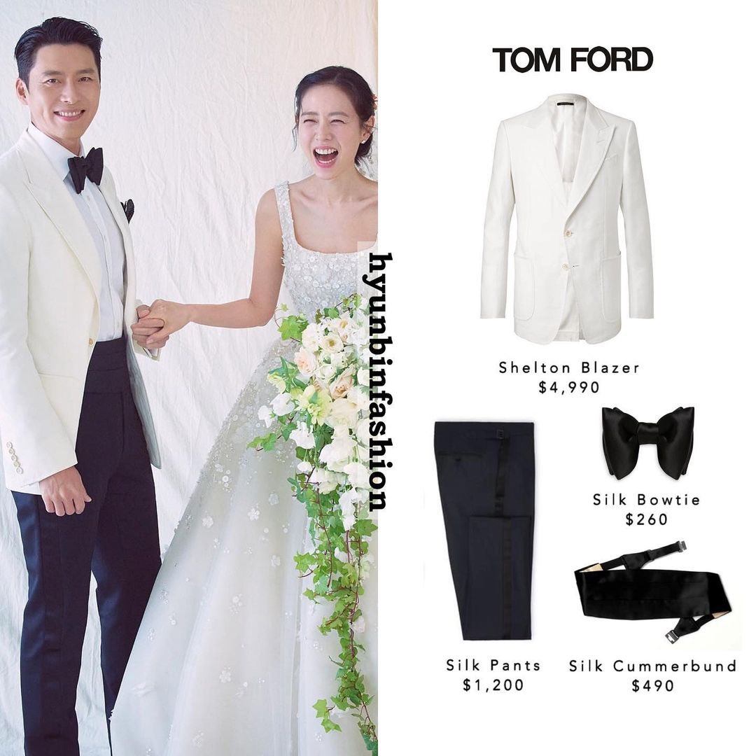 من جهة أخرى، اعتمد زوجها بدلة أنيقة مكونة من سترة باللون الآيفوري من توقيع العلامة التجارية "توم فورد" بقيمة 4.990 دولار أمريكي نسَّقها بقميص أبيض وبنطال كحلي من القماش، وتزيَّن بفيونكة أنيقة باللون الكحلي.
