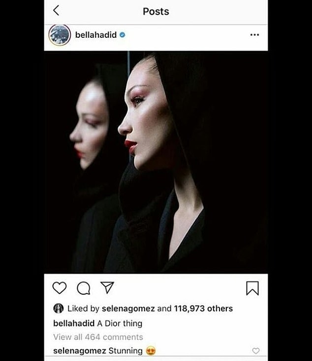 نشرت "بيلا" صورة لها عبر حسابها على موقع "إنستغرام" ترويجًا للعلامة التجارية "ديور"، وعلى الفور أبدت "سيلينا" إعجابها بالصورة وعلَّقت بـ"رائعة"، إلّا أن العارضة الحسناء قررت حذف الصورة نهائيًا من حسابها.
