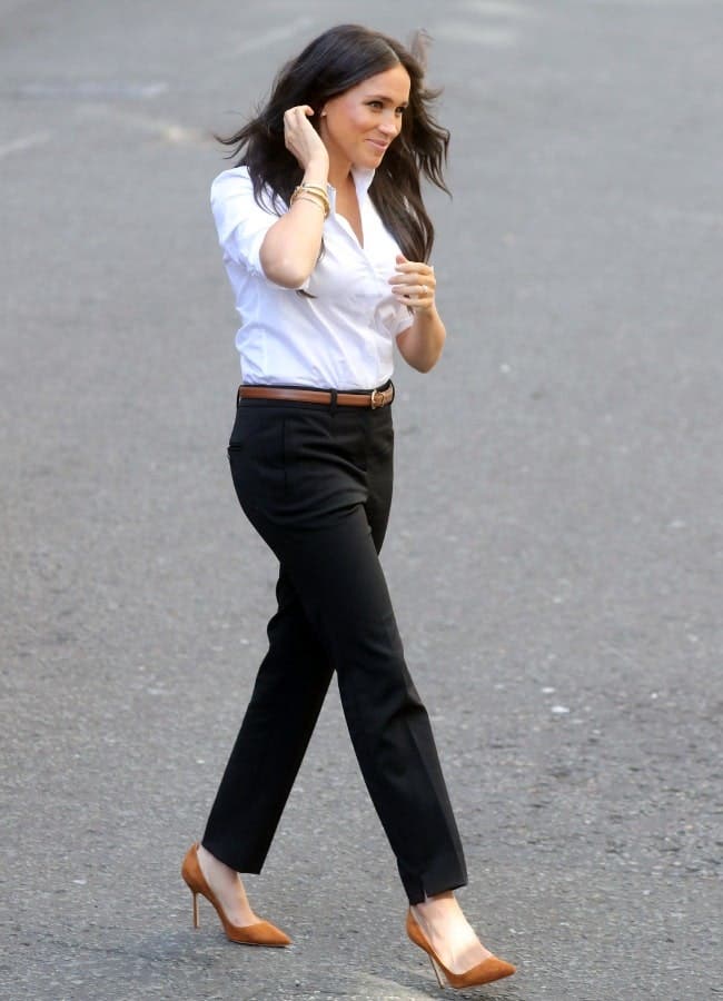 عادت "ميغان" للعمل بعد انتهاء فترة أمومتها مُرتدية بنطلون أسود رائع وقميص أبيض للعمل على مشروعها للازياء Smart Works.