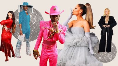 دائمًا ما يعتمد الاستعراضي الأمريكي إطلالات تتسم بلمسة أنثوية، فاختار طقمًا أزرق برَّاقًا مؤلف من سترة قصيرة وجامبسوت زُيِّن بنطال بشراشيب بيضاء، وأكمل زيه الغريب بقبعة رأس كبيرة مطابقة ومزيَّنة بشراشيب بيضاء برَّاقة تعمل إلكترونيًا!